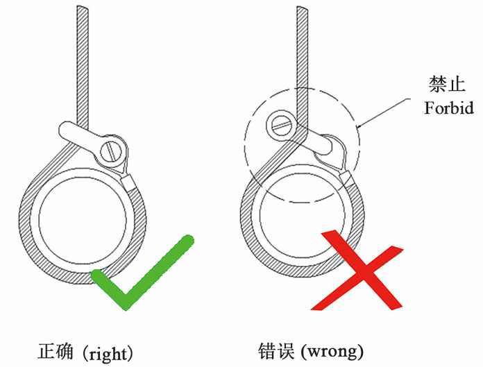 10.卸扣在与钢丝绳索具配套作为捆绑索具使用时,卸扣的横销部分应与钢丝绳索具的索眼进行连接,以免在索具提升时,钢丝绳与卸扣发生摩擦,造成横销转动,导致横销与扣体脱离(如下图)